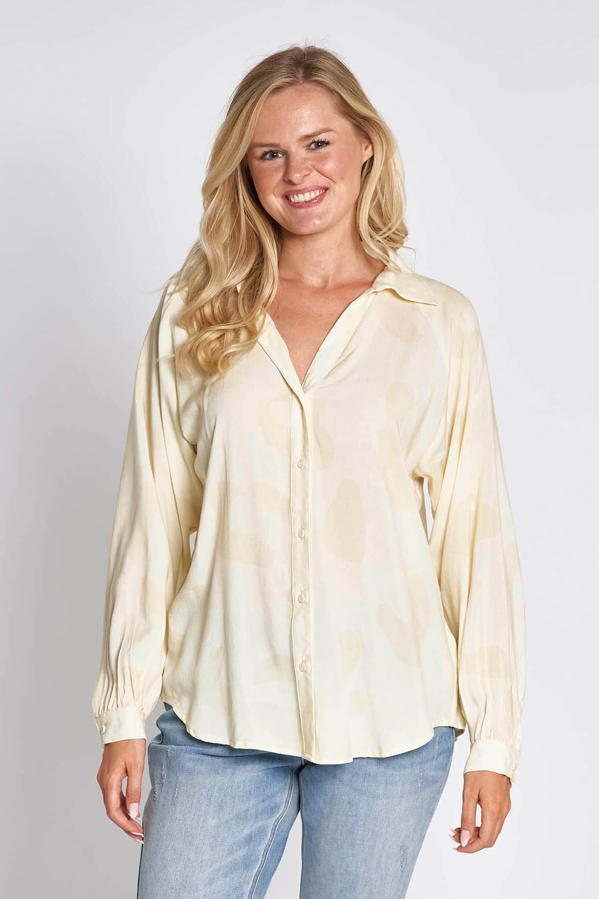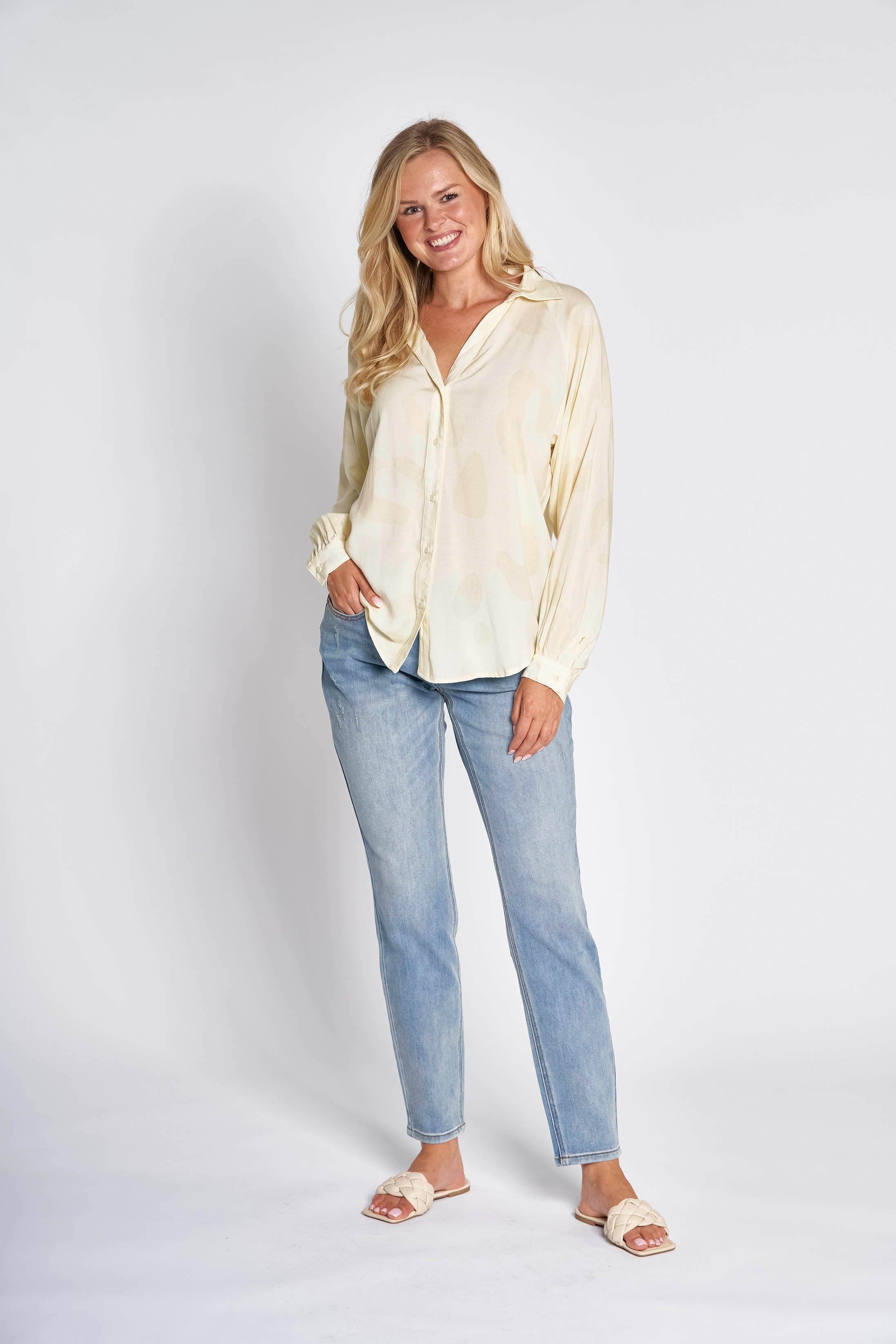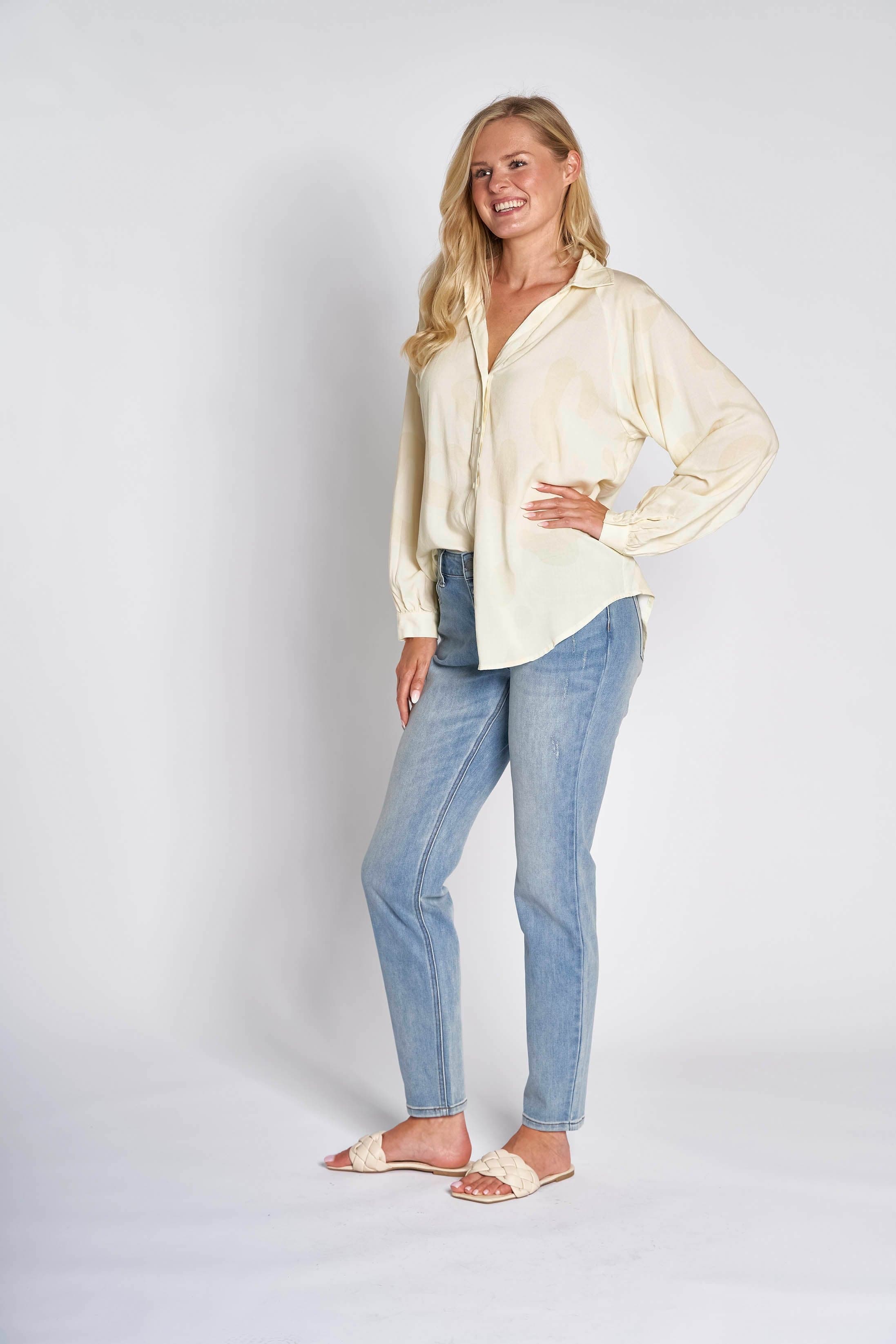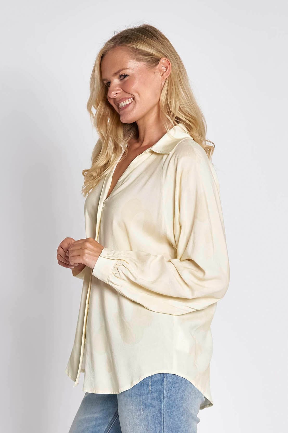 - Long sleeves with narrow cuffs and button closure