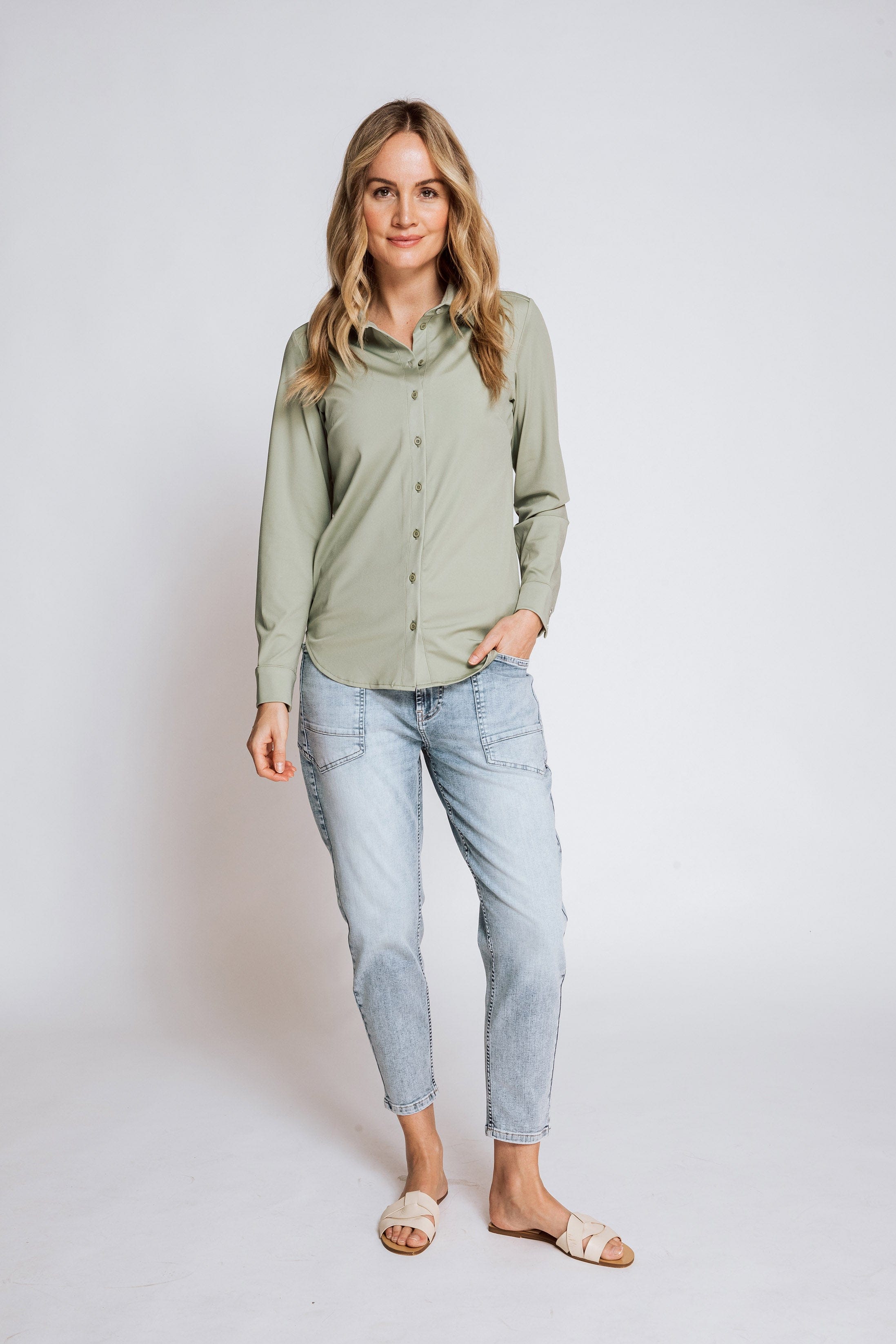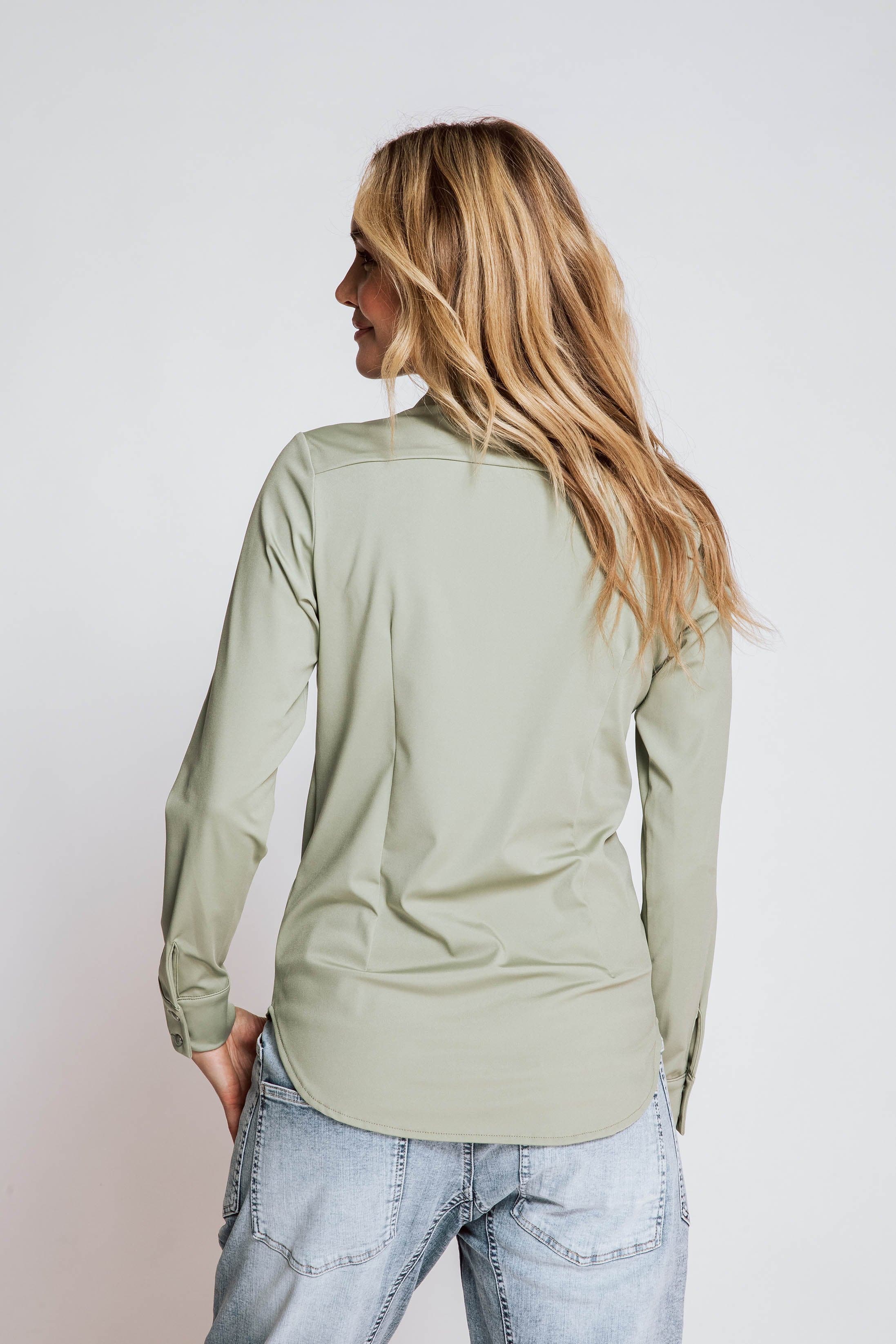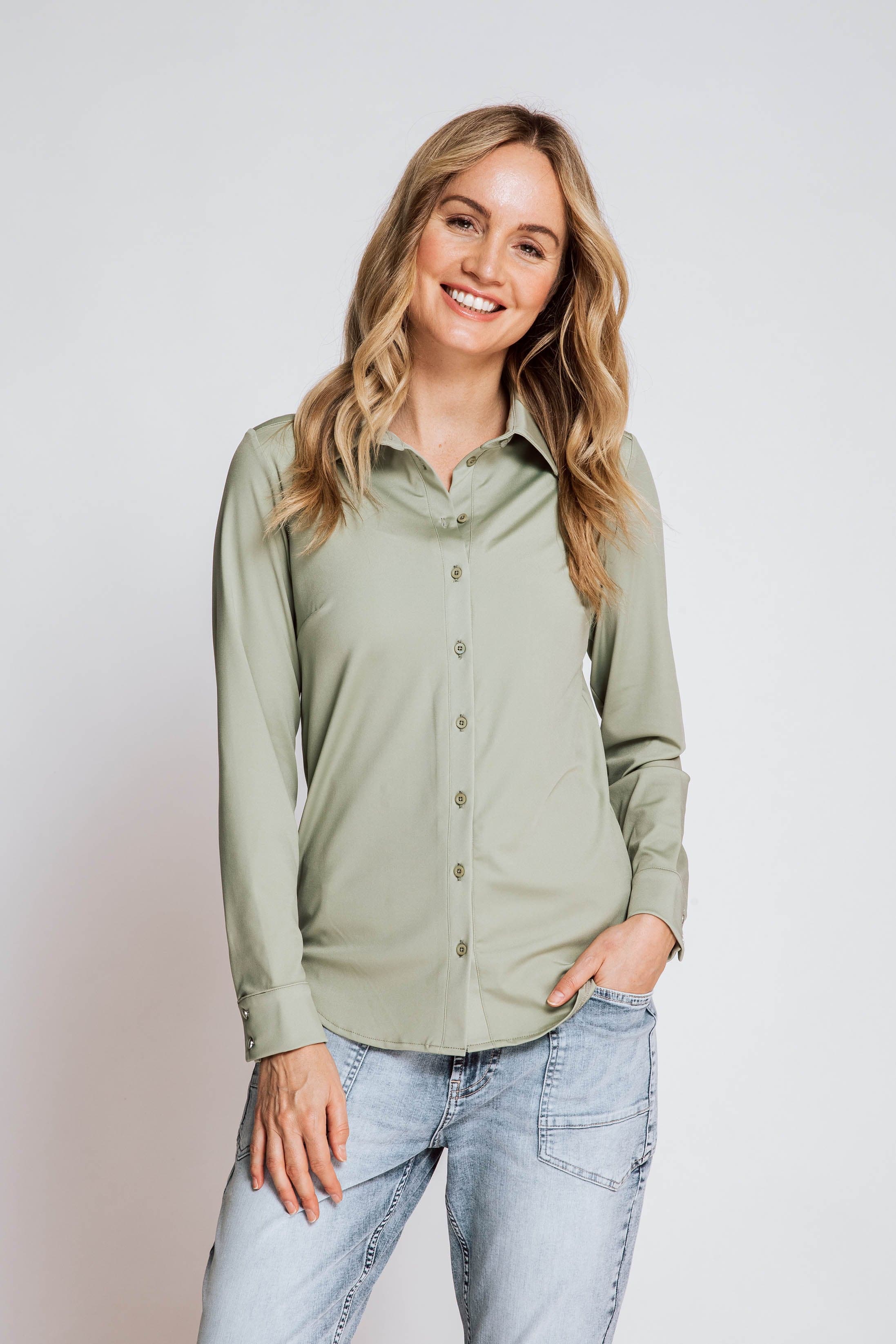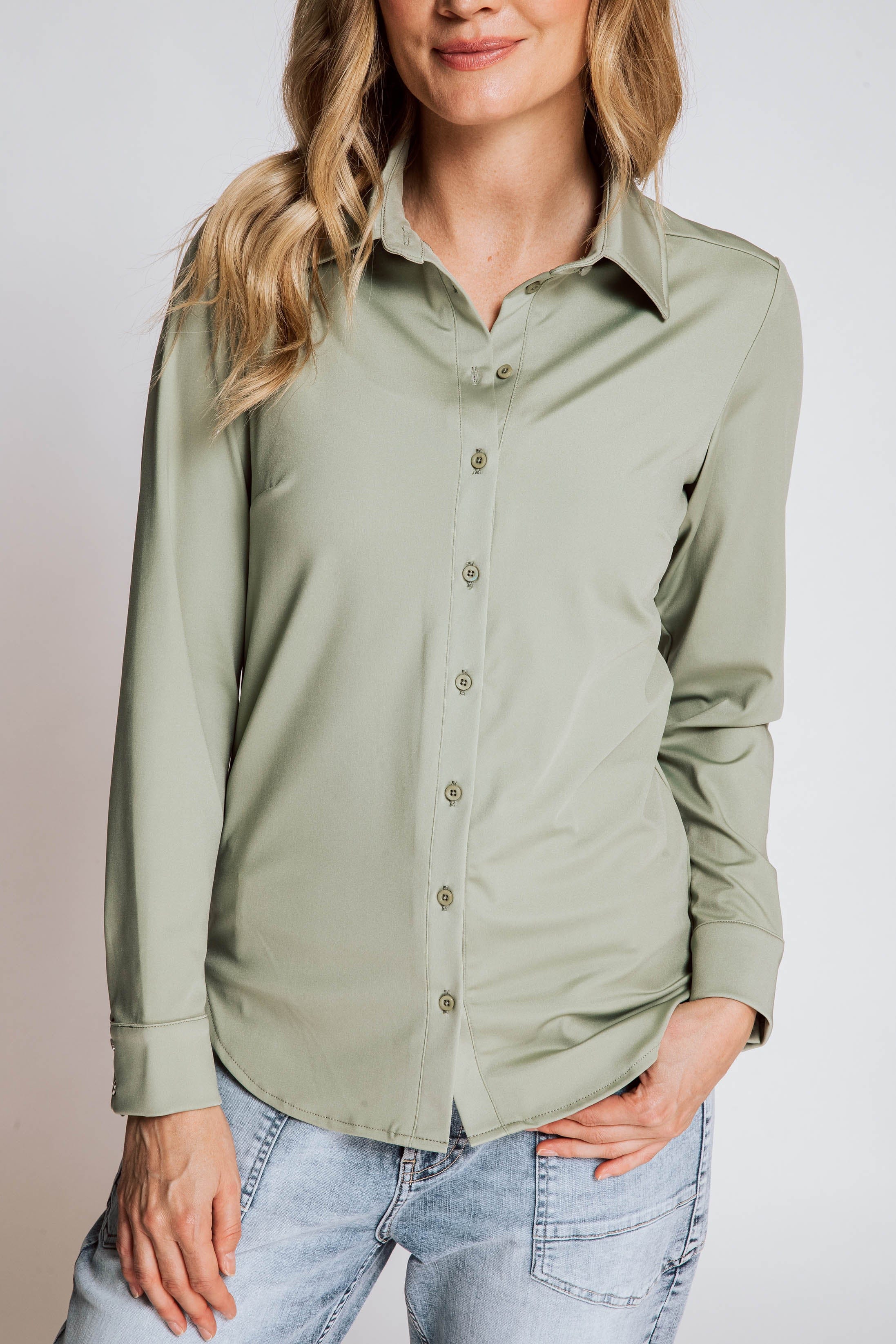 • Full-length button placket with subtly shiny buttons
