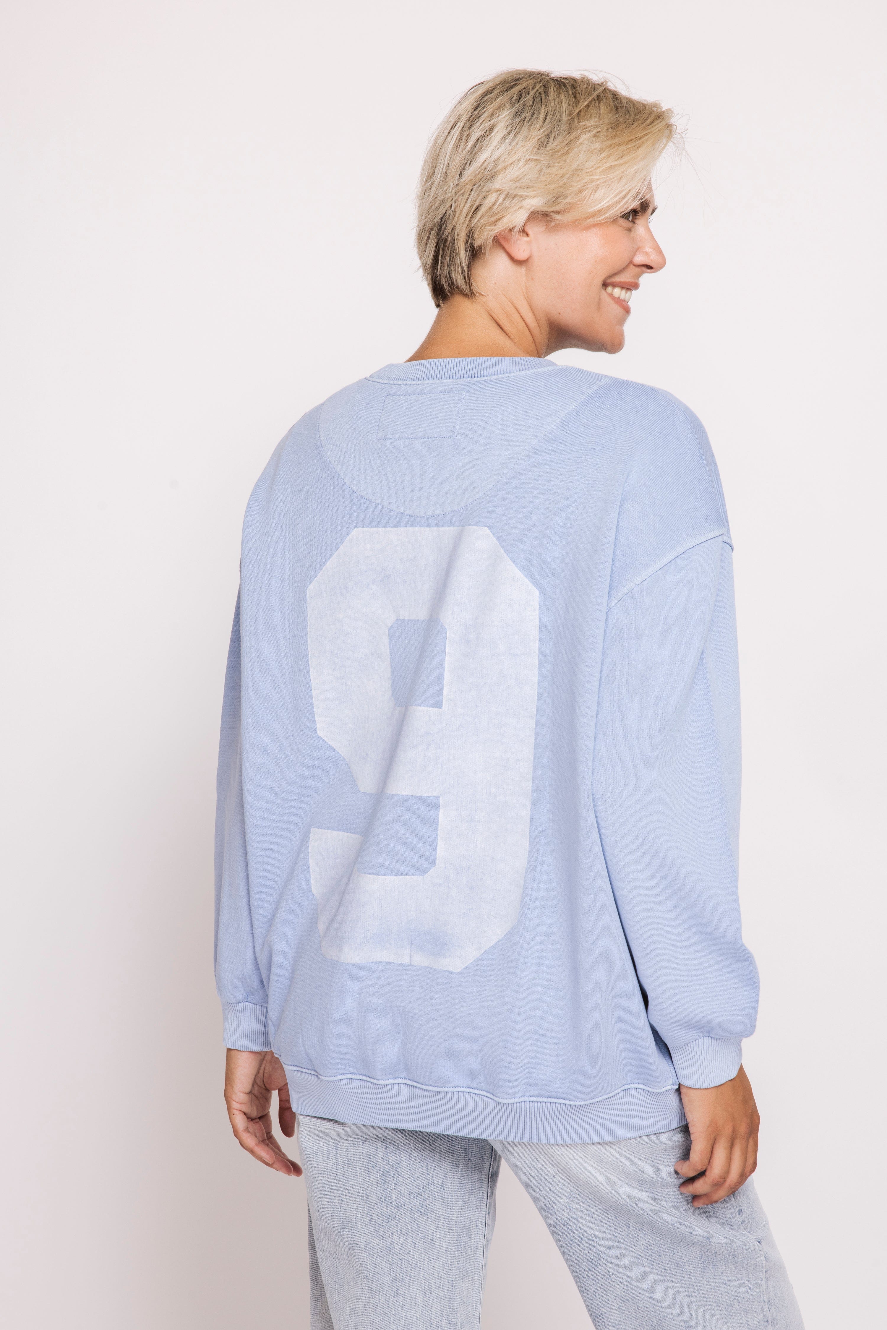 Großer weißer Patch mit der Zahl „9“ auf dem Rücken
